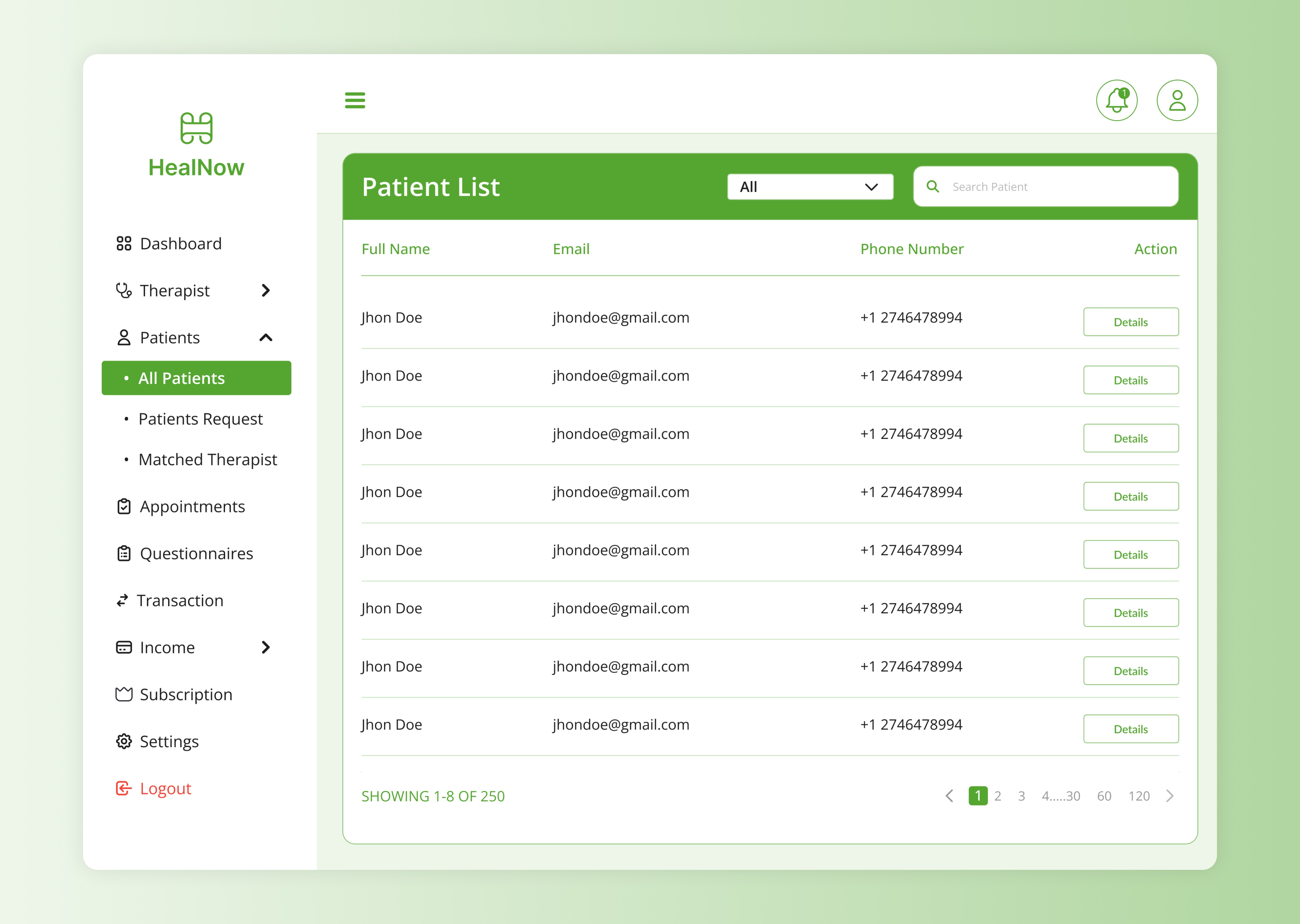 HealNow is a large-scale medical management dashboard designed for healthcare administrators. The platform centralizes patient and therapist management, tracks sessions, manages survey questions, and provides reporting tools. With over 100 carefully crafted screens, HealNow offers a complete system for clinics to operate more efficiently.
